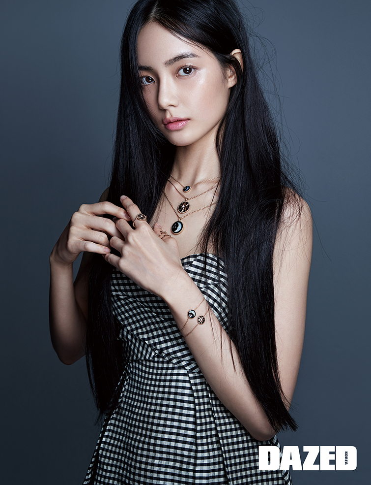 깅엄 체크 패턴의 벨 라인 튜브 드레스는 디올(Dior), 옐로 골드와 화이트 골드에 다이아몬드, 자개, 오닉스를 세팅한 해와 달 모티브의 로즈 셀레스트 네크리스와 로즈 셀레스트 브레이슬릿, 핑크 골드에 다이아몬드, 오닉스를 세팅한 별 모티브의 로즈 드 방 링과 로즈 드 방 브레이슬릿, 엄지에 착용한 다이아몬드 장식의 옐로 골드 소재 투아무아쥬뗌 링은 모두 디올 파인 주얼리(Dior Fine Jewelry).
