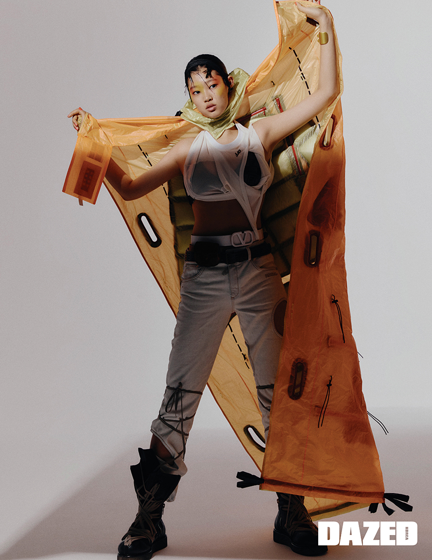 커팅 디테일 슬리브리스 톱과 데님 팬츠는 오프화이트(Off-White™), 안에 입은 비키니 톱은 펜디(Fendi), 망토로 연출한 아우터는 5 몽클레르 크레이그 그린(5 Moncler Craig Green), 부츠는 릭 오웬스(Rick Owens), V 로고 벨트는 발렌티노(Valentino Garavani), 벨트 백은 폴로 랄프 로렌(Polo Ralph Lauren), 왼쪽 손목에 찬 골드 브레이슬릿은 에르메스(Hermès).
