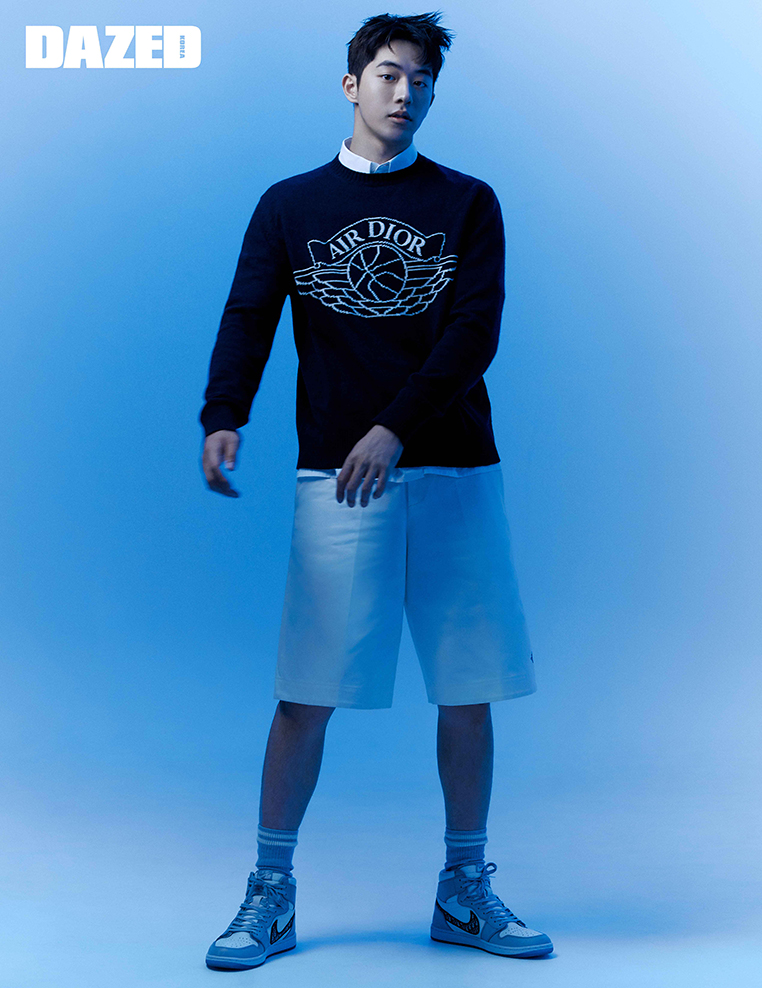 니트 톱과 셔츠, 버뮤다 팬츠, 양말, 에어 디올 하이톱 스니커즈는 모두 디올맨(Dior Men).