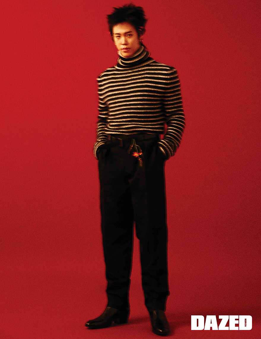 니트 톱과 팬츠, 벨트, 슈즈는 모두 생 로랑 by 안토니 바카렐로(Saint Laurent by Anthony Vaccarello).
