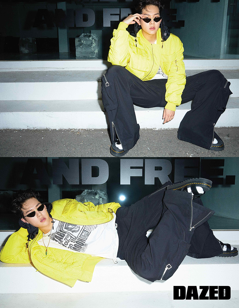 옐로 보머 재킷과 블랙 팬츠는 우영미(Wooyoungmi), 이너로 입은 레터링 티셔츠는 메종 마르지엘라(Maison Margiela), 블랙 샌들은 닥터마틴(Dr. Martens), 펜던트 네크리스는 디올 맨(Dior Men), 선글라스와 아이웨어 액세서리는 젠틀몬스터(Gentle Monster), 양말은 스타일리스트의 것.