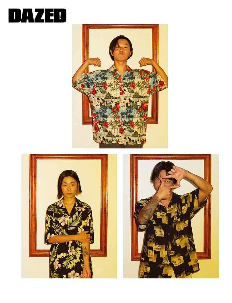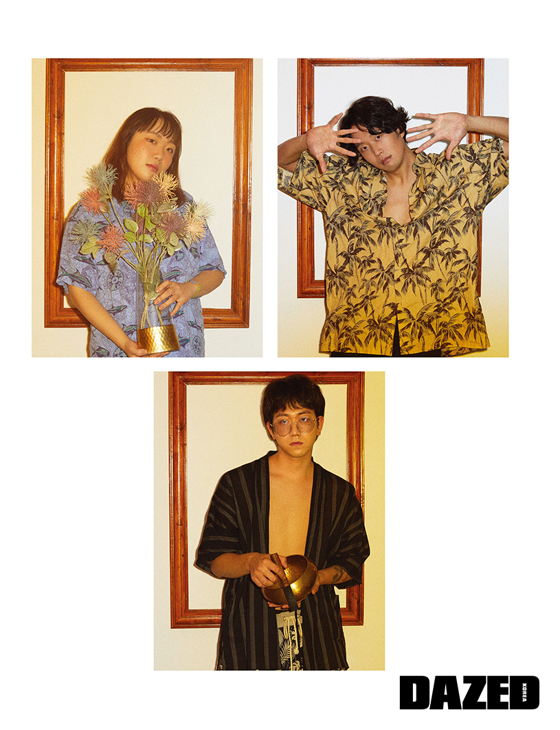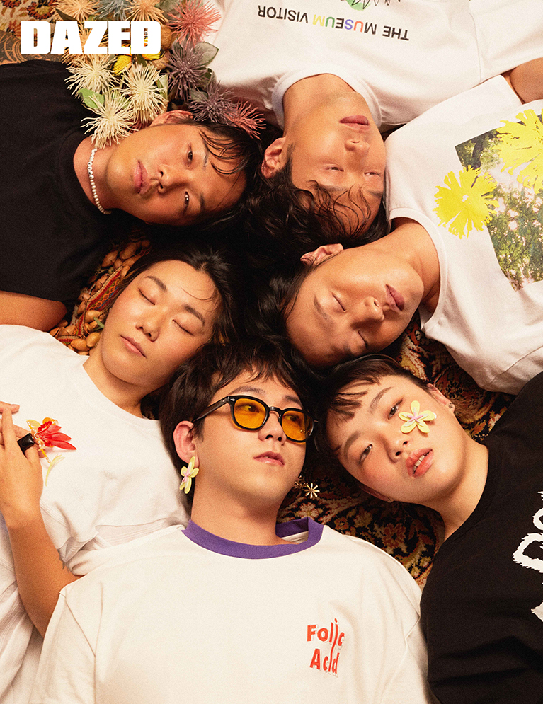 (왼쪽 위부터 시계 방향)현석이 입은 톱은 아크네 스튜디오(Acne Studios), 네크리스는 에디터의 것. 동훈이 입은 톱은 더 뮤지엄 비지터(The Museum Visitor). 목박이 입은 톱은 더 뮤지엄 비지터(The Museum Visitor). 문치가 입은 톱은 아조바이아조(Ajobyajo), 얼굴 위에 연출한 이어링은 프루타(Fruta), 이어링은 문치의 것. 진호가 입은 톱은 스튜디오 톰보이(Studio Tomboy), 선글라스는 모스콧(Moscot), 모든 이어링은 프루타(Fruta). 송아가 입은 톱은 아조바이아조(Ajobyajo), 티셔츠 위에 얹고 귀에 착용한 이어링은 한킴(Hankim).