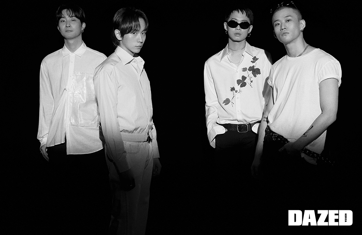 온니가 입은 셔츠는 더 뮤지엄 비지터(The Museum Visitor), 팬츠는 에디터의 것, 이어링은 온니의 것. 라디오피어가 입은 재킷과 팬츠, 벨트는 모두 에디터의 것. 어라이브999가 입은 셔츠는 알렉산더 맥퀸(Alexander McQueen), 선글라스는 릭 오웬스(Rick Owens), 네크리스는 모멘텔(Momentel Jewelry), 벨트와 팬츠, 이어링은 어라이브999의 것. 아발론이 착용한 네크리스는 모멘텔(Momentel Jewelry), 티셔츠와 팬츠, 선글라스, 벨트, 이어링은 모두 아발론의 것.