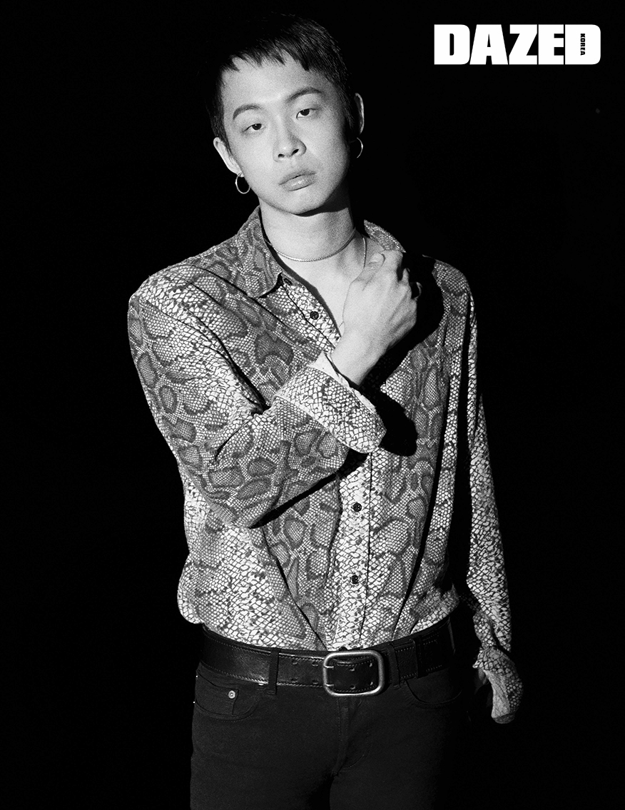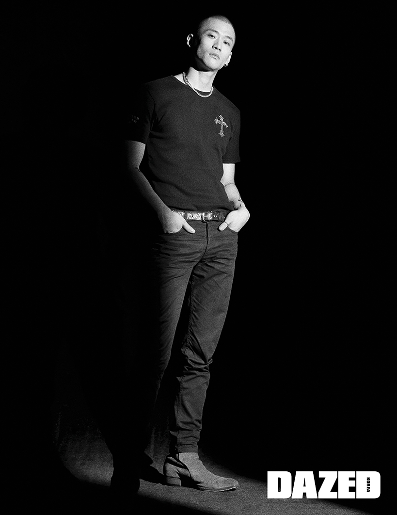 어라이브999가 착용한 네크리스는 모멘텔(Momentel Jewelry), 셔츠와 벨트, 팬츠, 이어링은 모두 어라이브999의 것.