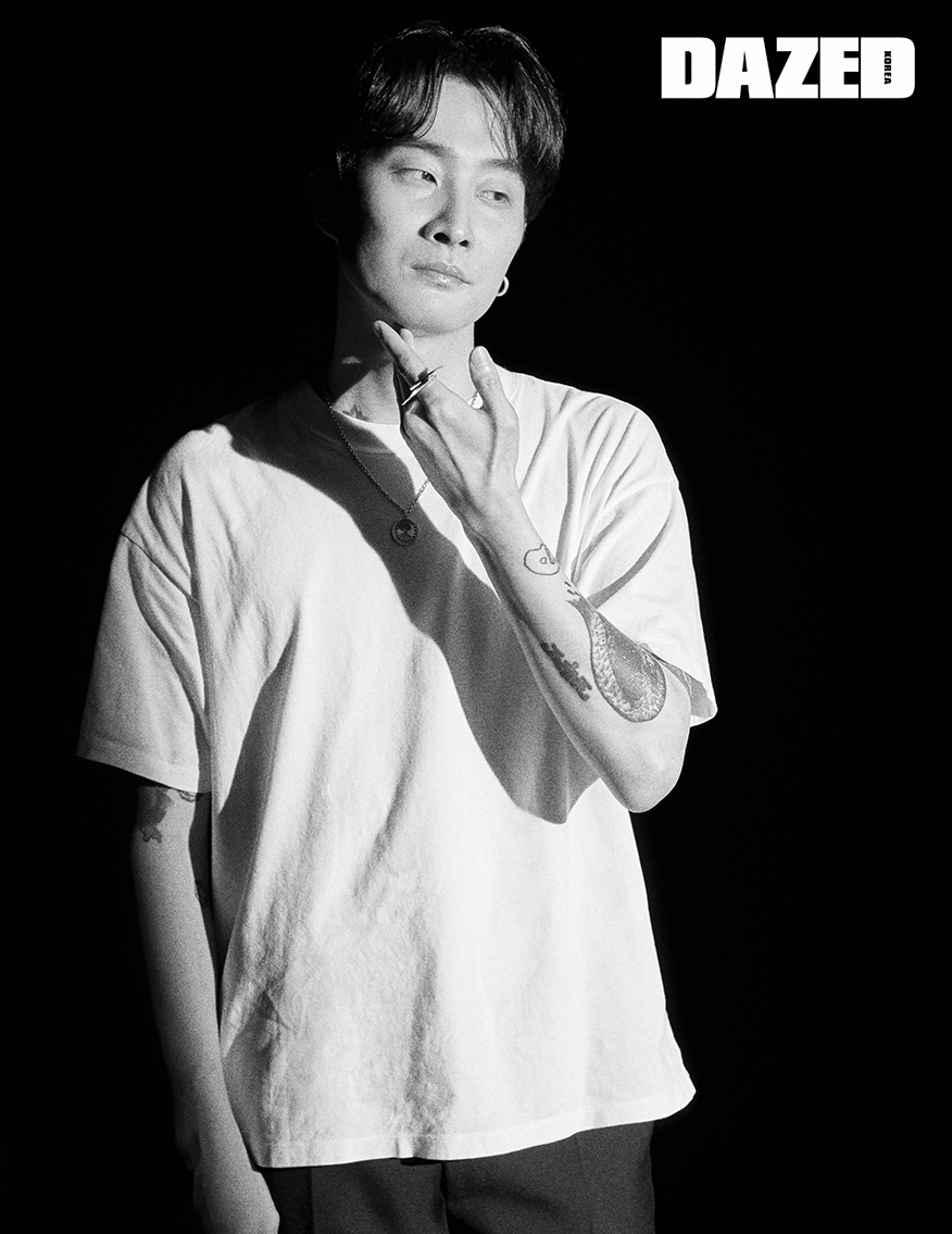 온니가 착용한 네크리스는 모멘텔(Momentel Jewelry), 티셔츠와 팬츠, 링은 모두 에디터의 것.