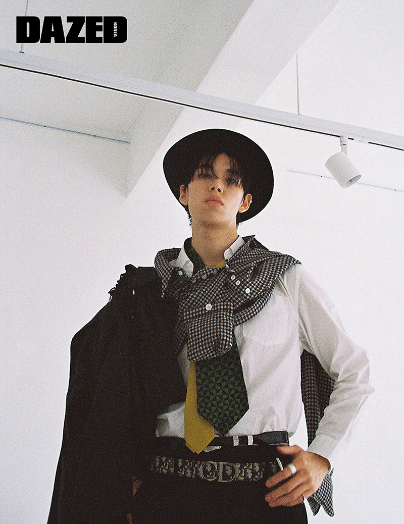 어깨에 두른 체크 셔츠와 한쪽 어깨에 걸친 블랙 재킷은 성주(Sungju), 팬츠는 에디터 소장품, 디올 오블리크 벨트와 링은 디올 맨(Dior Men), 옐로 타이는 프라다(Prada), 레이어드한 패턴 타이와 검정 벨트, 새끼손가락에 낀 링, 펠트 해트는 모두 에디터의 것.