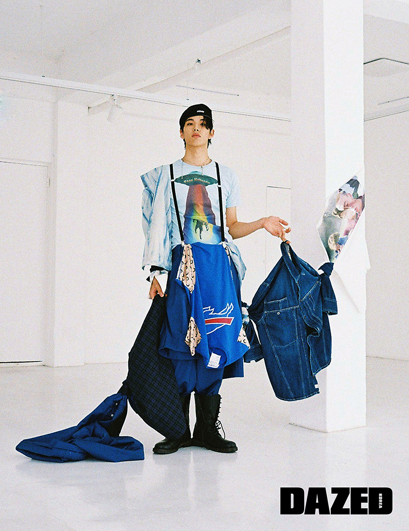 우주선 프린트 티셔츠는 파코라반(Paco Rabanne) 제품으로 에디터의 것, 한쪽 어깨에 걸쳐 입은 재킷은 블라인드니스(Blindness), 에이프런처럼 연출한 톱은 마린 세르 by 매치스패션(Marine Serre by Matchesfashion), 해체적인 디자인의 팬츠와 왼쪽 끝에 묶은 파란 재킷은 성주(Sungju), 재킷과 연결된 체크 패턴 셔츠와 기둥에 묶은 스웨트 셔츠는 프레드페리(Fred Perry), 묶어 연출한 데님 재킷은 디젤(Diesel), 레이스업 워커와 서스펜더, 베레, 네크리스, 링은 모두 에디터의 것.