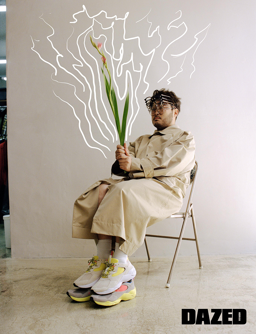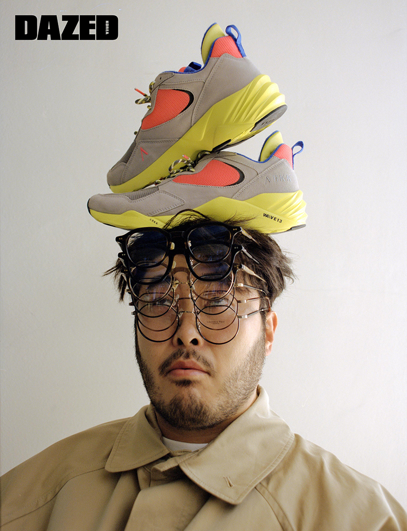 머리에 얹은 스니커즈 ‘카네틱’은 아크 코펜하겐(Arkk Copenhagen), 베이지 코트는 헤드 메이너 by 원엘디케이(Hed Mayner by 1LDK), 이너로 입은 화이트 톱은 COS, 모든 안경은 로렌스 폴(Laurence Paul).