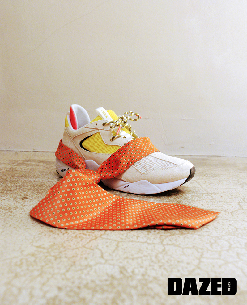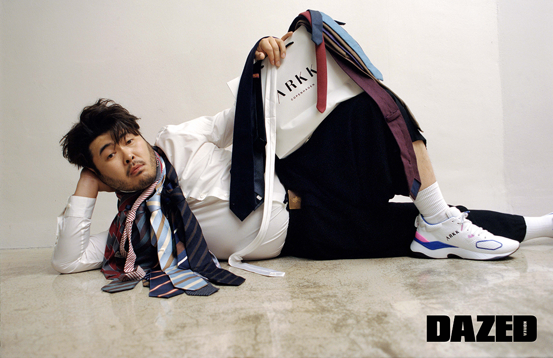 스니커즈 ‘포쓸’은 아크 코펜하겐(Arkk Copenhagen), 화이트 셔츠는 H&M, 와이드 팬츠는 요지 야마모토(Yohji Yamamoto), 모든 넥타이는 스타일리스트의 것.