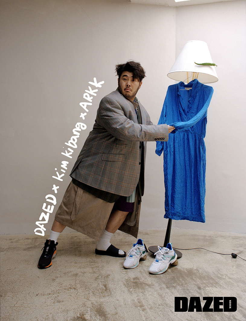 블랙 컬러 스니커즈 ‘스톱라이더’와 소프트 그레이 컬러 스니커즈 ‘크루저’는 아크 코펜하겐(Arkk Copenhagen), 이너로 입은 스트라이프 셔츠는 로톨(Rotol), 블랙 하프 팬츠는 스투시(Stussy), 레이어드한 체크 재킷과 그린 컬러 오버사이즈 재킷, 트렌치코트, 조명에 건 파란색 원피스는 모두 스타일리스트의 것.