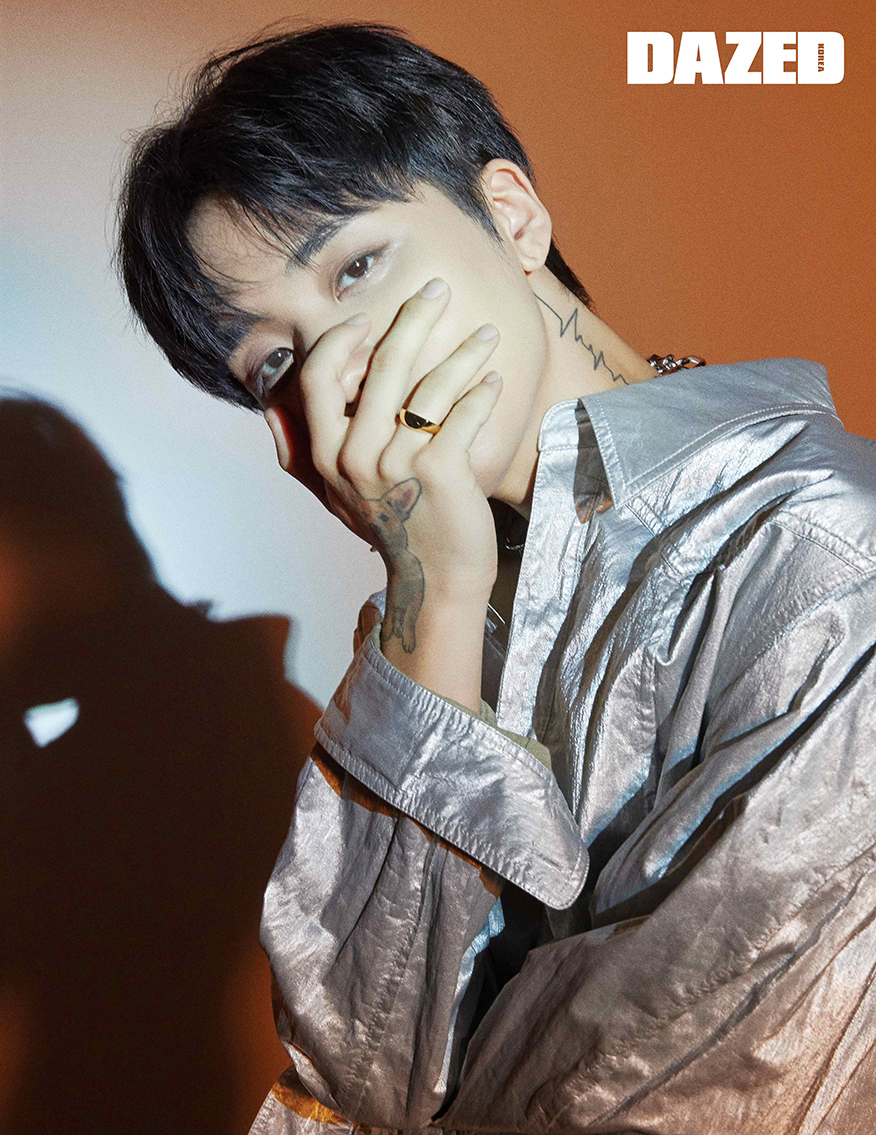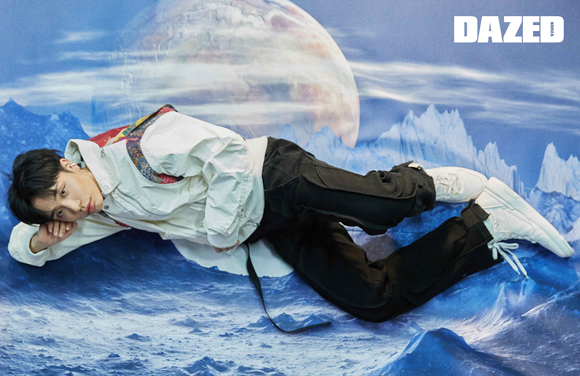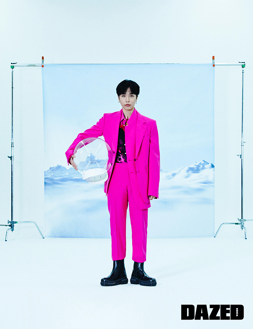 재킷은 더 뮤지엄 비지터(The Museum Visitor), 팬츠는 크래니어스(Craniuss), 슈즈는 지방시(Givenchy), 이어커프는 포트레이트 리포트(Portrait Report).