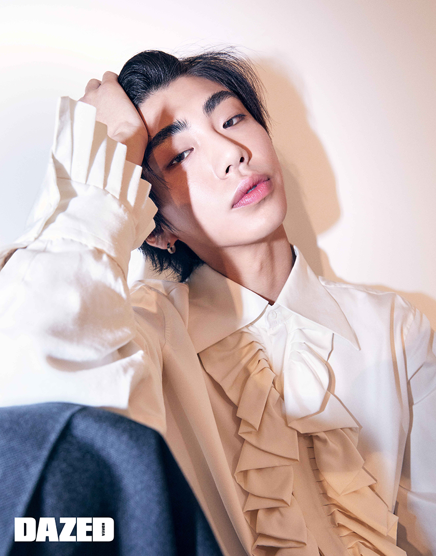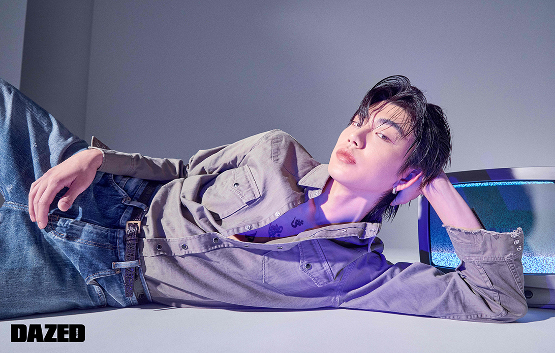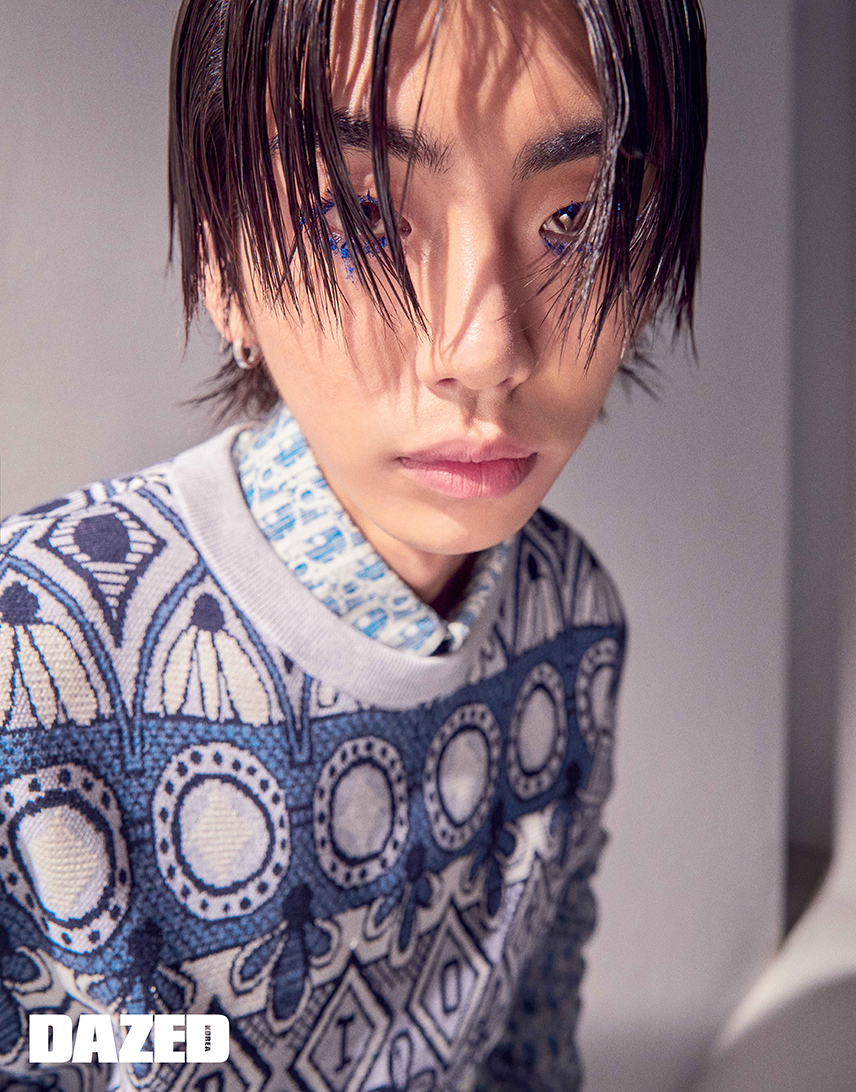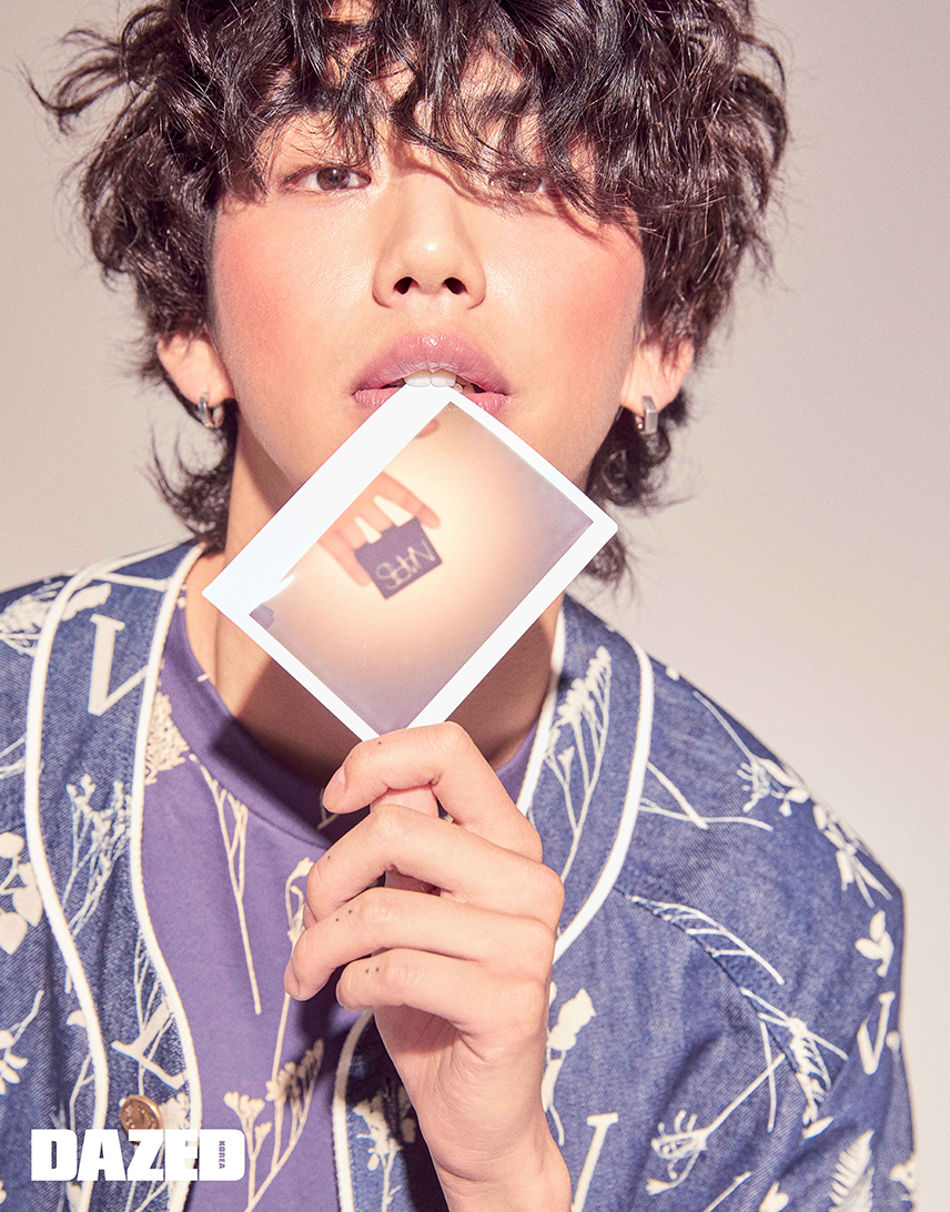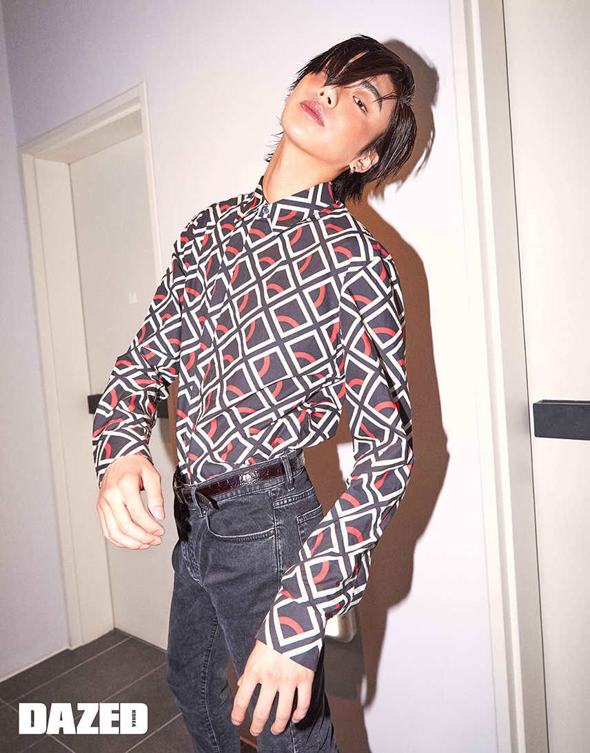 패턴 셔츠는 메종 마르지엘라 by 육스닷컴(Maison Margiela by YOOX.com), 데님 팬츠는 아크네 스튜디오(Acne Studios), 이어링과 벨트는 준성의 것.