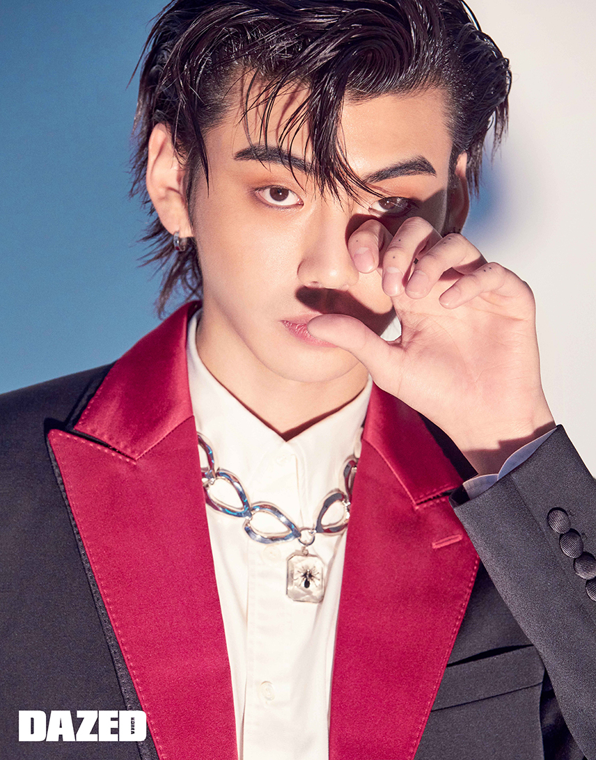 레드 포인트 슈트와 화이트 셔츠, 스파이더 포인트 이어링, 볼드한 네크리스는 모두 알렉산더 맥퀸(Alexander McQueen), 후프 이어링은 준성의 것.