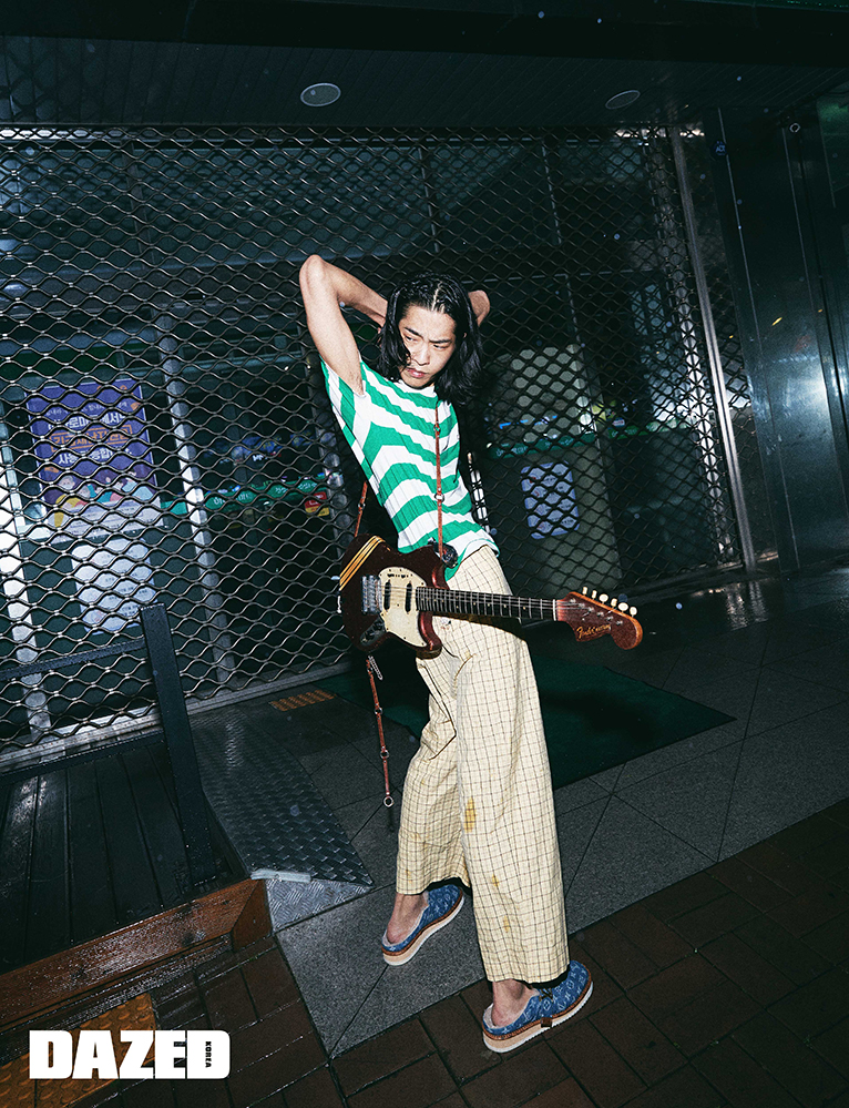 스트라이프 티셔츠와 체크 팬츠는 구찌(Gucci), 블로퍼는 루이 비통(Louis Vuitton).