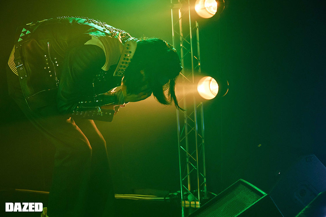 스터드 라이더 재킷, 스트라이프 티셔츠는 알렉산더 맥퀸(Alexander McQueen), 팬츠는 생 로랑 by 안토니 바카렐로(Saint Laurent by Anthony Vaccarello), 링은 부클리어(Bouclier).