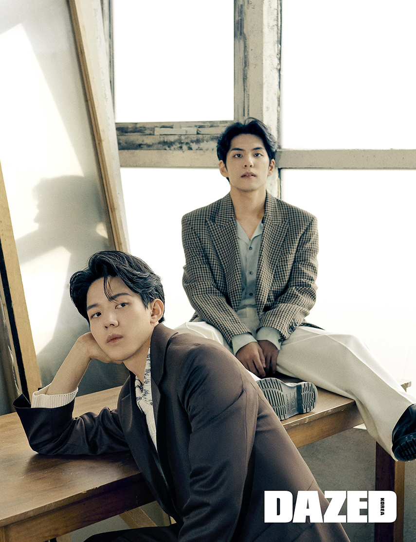 도운이 입은 브라운 슈트는 베일가(Veilga), 프린트 셔츠는 아워레가시 by 매치스패션(Our Legacy by Matchesfashion), 흰색 니트는 준지(Juun.J), 원필이 입은 체크 더블 재킷은 8 by 육스(8 by YOOX), 민트 컬러 셔츠는 오디너리 피플(Ordinary People), 흰색 와이드 팬츠는 베일가(Veilga), 블랙 첼시 부츠는 닥터마틴(Dr.Martens).