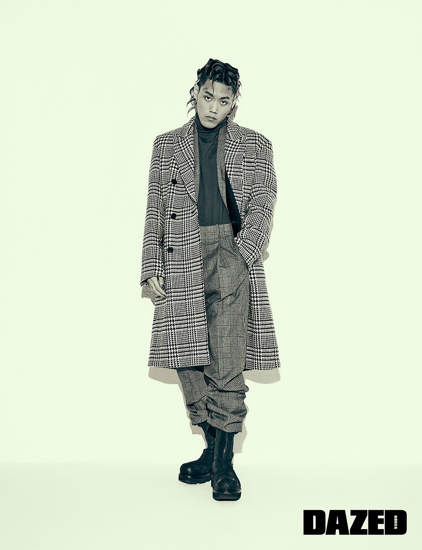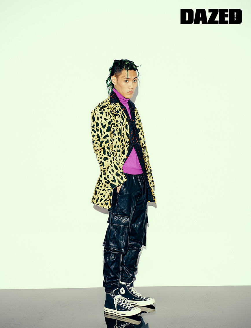 레오퍼드 재킷은 드리스 반 노튼(Dries Van Noten), 실크 셔츠와 터틀넥 니트는 벨루티(Berluti), 레더 팬츠는 준지(Juun.J), 스니커즈는 컨버스(Converse).