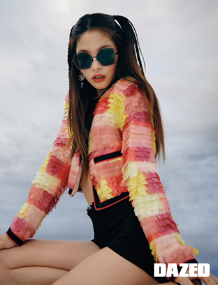 레진 소재의 버터플라이 선글라스는 샤넬 아이웨어(Chanel Eyewear), 실크 오간자 소재의 재킷, 크레이프 드 신 소재의 쇼츠, 컬러 스트라스 소재의 로고 이어링, 블랙 로고 벨트는 모두 샤넬(Chanel).