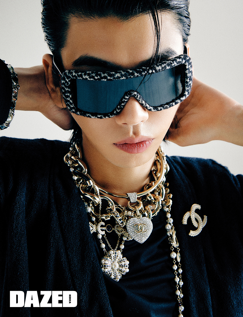 실크 트위드로 장식한 실드 선글라스는 샤넬 아이웨어(Chanel Eyewear), 테리 글로스 소재의 재킷과 하트 모양의 스트라스 소재 네크리스, 블랙과 메탈로 엮은 카프스킨 소재의 네크리스, 스트라스 소재 네크리스, 펄과 글라스 소재의 네크리스, 재킷에 연출한 로고 브로치, 메탈과 카프스킨 소재의 브레이슬릿은 모두 샤넬(Chanel), 이너로 입은 톱은 에디터의 것.