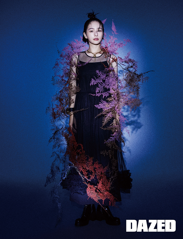 시스루 원피스는 몰리 고다드(Molly Goddard), 슬립 원피스는 더오픈프로덕트(TheOpen Product), 네크리스는 디올(Dior), 브레이슬릿은 프라다(Prada), 부츠는 미우 미우(Miu Miu).