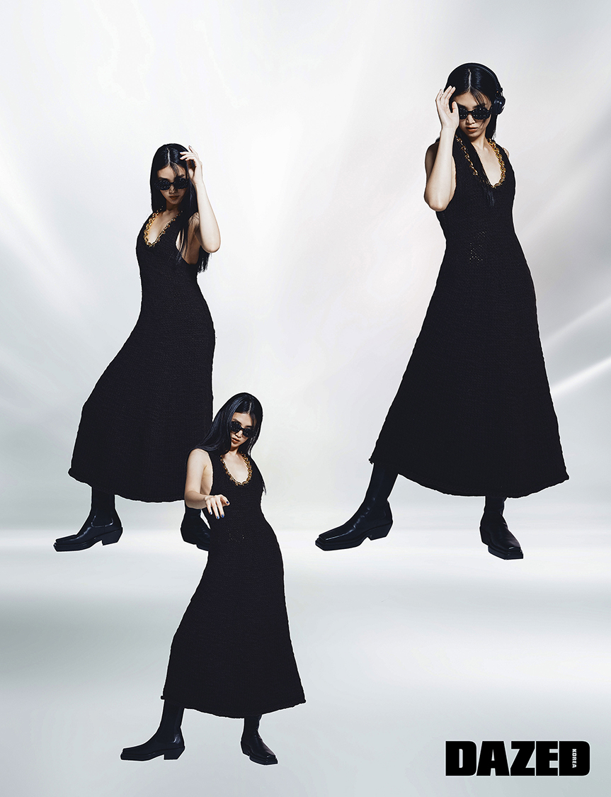 니트 드레스와 부츠는 보테가 베네타(Bottega Veneta), 선글라스는 오타쿠레이스(Otakurace).