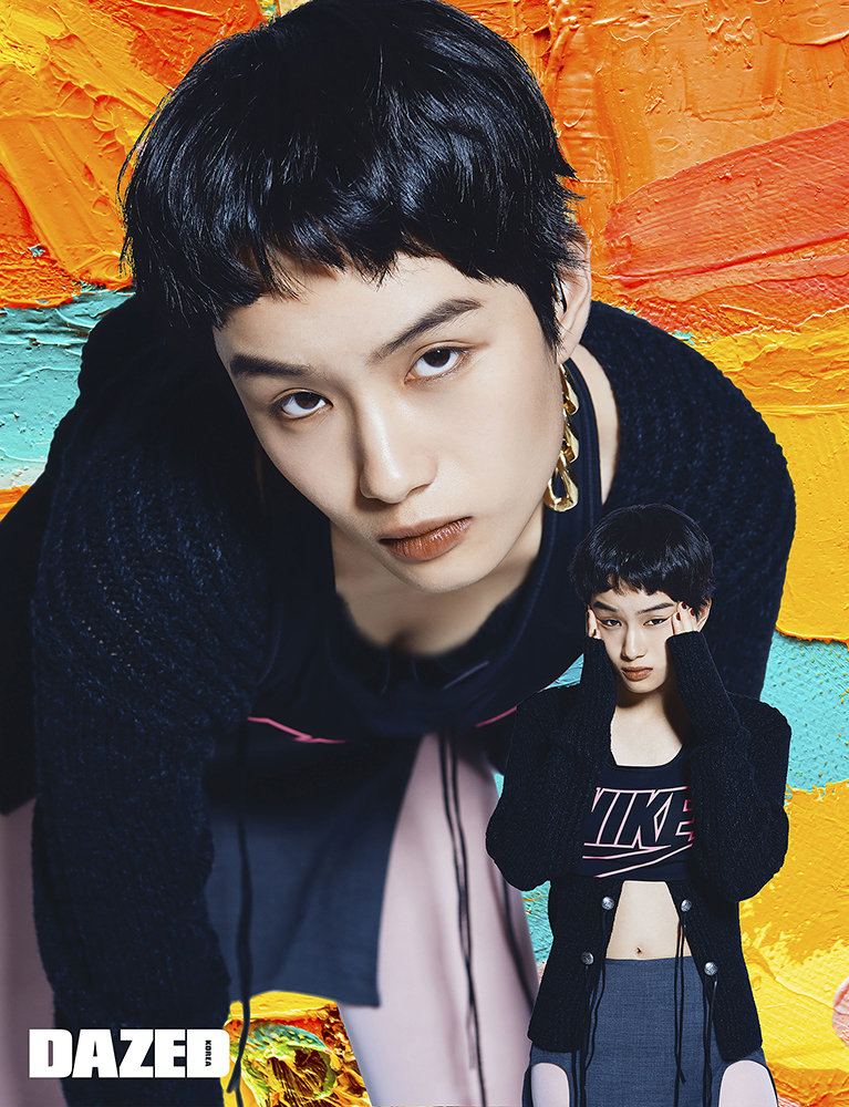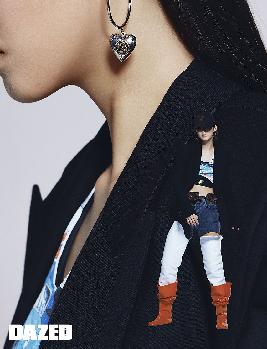 재킷은 준지(Juun.J), 브라톱은 나이키(Nike), 브라톱 위에 연출한 하네스와 레더 부츠 모티브 팬츠는 다이드(Dyed), 모자는 파라코즘 스튜디오(Paracosm Studio), 후프 이어링은 알렉산더 맥퀸(Alexander McQueen), 러버 부츠는 한킴(Hankim).