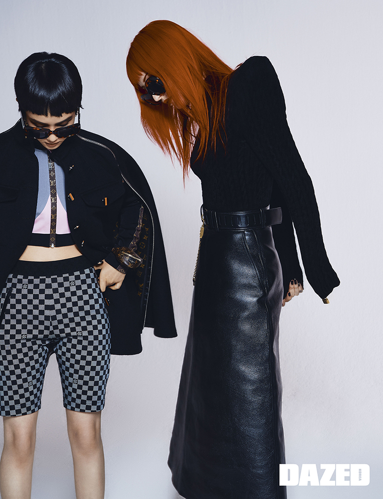 호연이 입은 케이프와 크롭트 집업 톱, 바이커 쇼츠, 이어링, 파티 범백 브레이슬릿은 모두 루이 비통(Louis Vuitton), 선글라스는 발렌시아가(Balenciaga). 마리아나가 입은 파고다 숄더 톱과 레더 스커트, 선글라스, 자물쇠 모티브 링, 벨트는 모두 발렌시아가(Balenciaga).