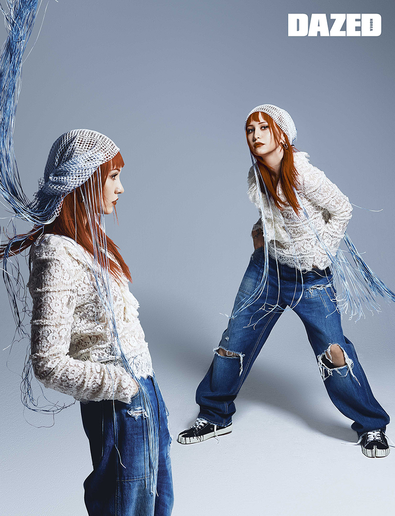블라우스와 데님 팬츠는 구찌(Gucci), 스니커즈는 메종 마르지엘라(Maison Margiela), 두건으로 연출한 스카프는 도혜 윤(Dohye Yun).