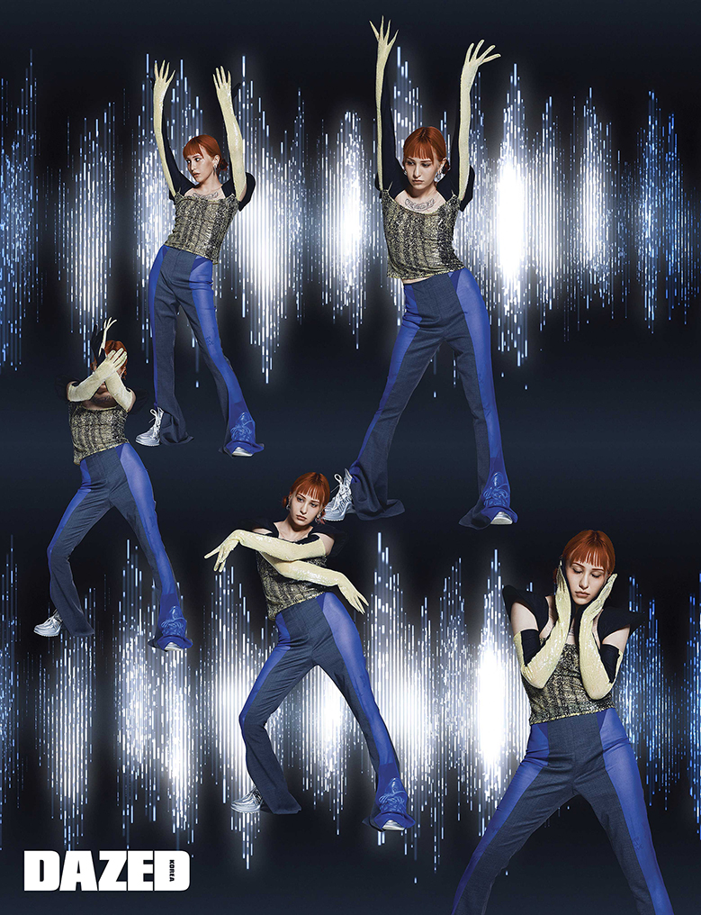 스팽글 톱과 시스루 디테일 팬츠는 도혜 윤(Dohye Yun), 아치 라이트 스니커즈는 루이 비통(Louis Vuitton).