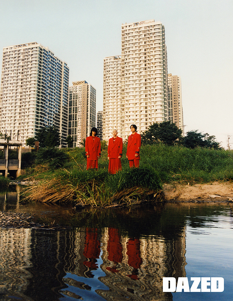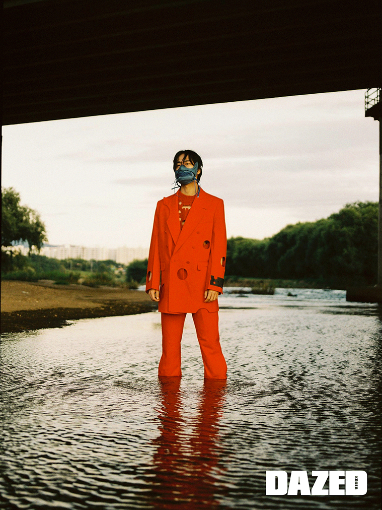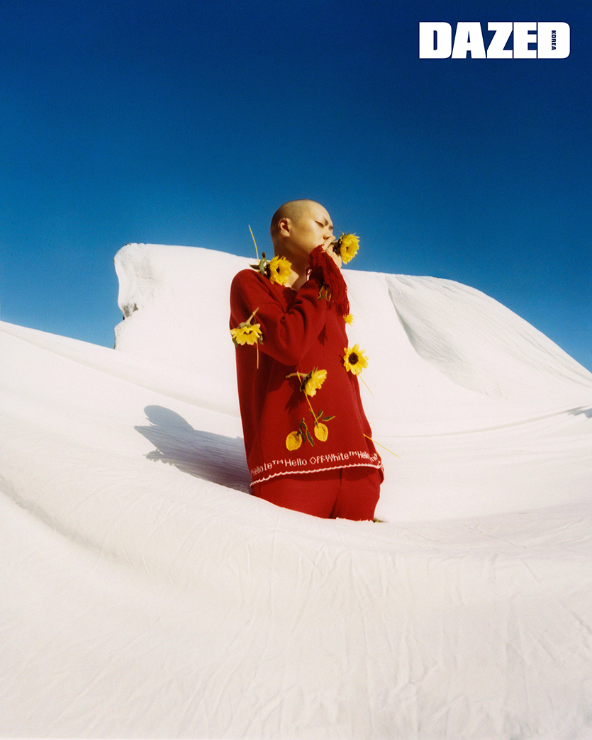 자수 장식을 넣은 빨간 스웨터는 오프화이트(Off-White™). 빨간 팬츠는 혁오를 위해 버질 아블로가 제작한 것으로 오프화이트 X 혁오(Off-White™ X Hyukoh).