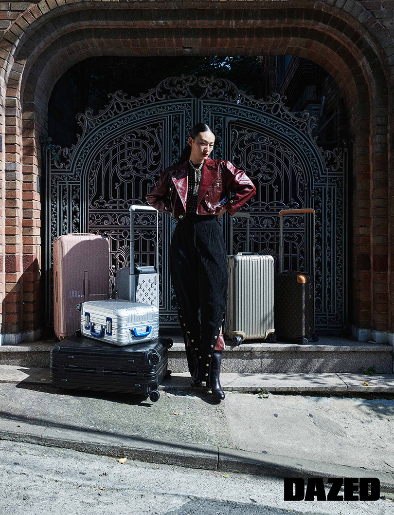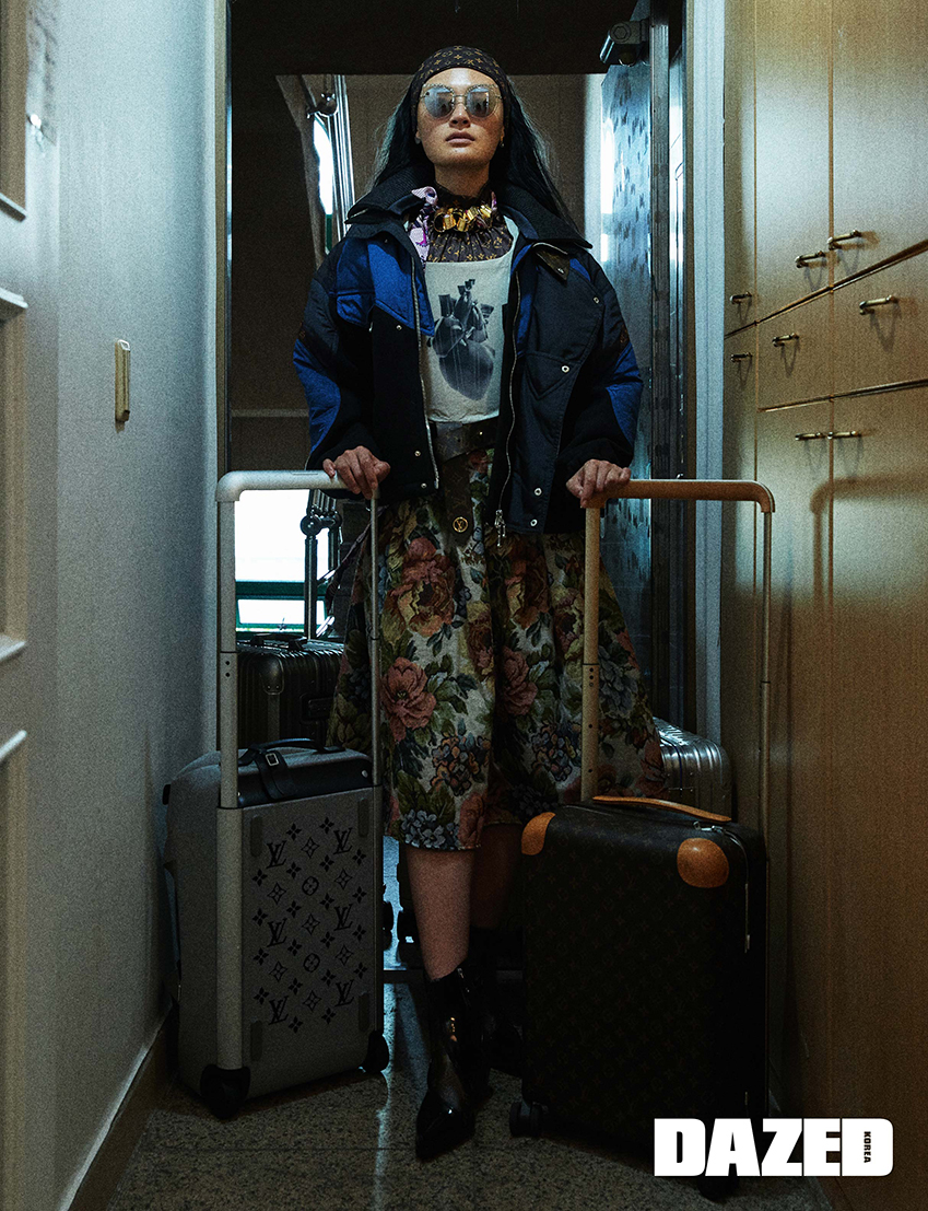 점퍼와 로고 플레이 톱, 부츠, 헤어밴드, 이어링, 스카프로 연출한 네크리스, 벨트, 양손에 들고 있는 트렁크는 모두 루이 비통(Louis Vuitton), 코르셋 톱과 자카르 스커트는 2000아카이브(2000archives), 선글라스는 카린(Carin), 뒤에 놓인 모든 트렁크는 리모와(Rimowa).