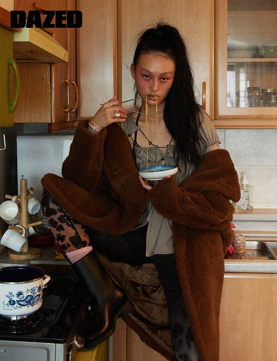 테디베어 코트는 막스마라(Max Mara), 스트링 톱과 시스루 드레스는 2000아카이브(2000archives), 레오퍼드 패턴 레깅스는 H&M, 레인 부츠는 로저 비비에(Roger Vivier), 실버 링과 클릭아슈 브레이슬릿은 에르메스(Hermès).