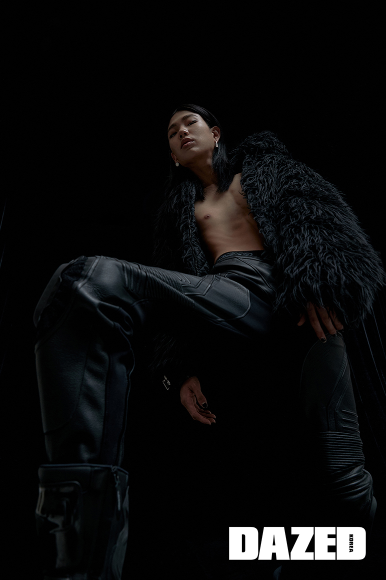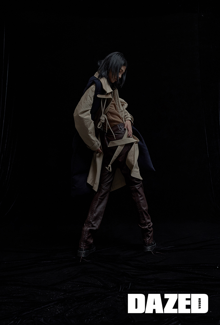 패딩 재킷은 1 몽클레르 JW 앤더슨(1 Moncler JW Anderson), 트렌치코트는 디올 맨(Dior Men), 니트 톱과 부츠는 펜디(Fendi), 레더 팬츠는 지방시(Givenchy).