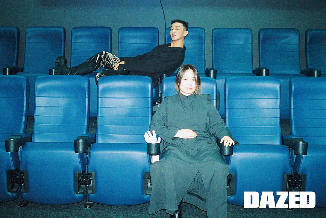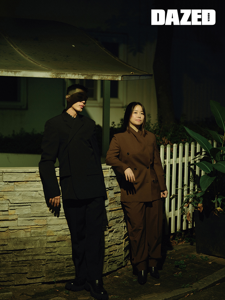 아인이 입은 재킷과 셔츠, 팬츠, 청키솔 로퍼는 모두 발렌시아가(Balenciaga). 의정이 입은 슈트는 푸시버튼 by 네타포르테(Push Button by Net-A-Porter), 부츠 힐은 레이첼 콕스(Rachel Cox).
