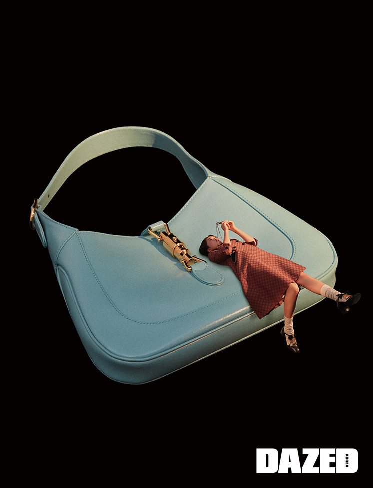 블랙 레더 미니 재키 1961 호보 백과 블랙 미니드레스, 모헤어 카디건, 크롭트 셔츠, 체크 미니스커트, 체인 디테일 메리제인 펌프스 힐, 니트 헤드 커버, 카디건에 단 레진 브로치, 알파카 울 삭스, 크리스털 하트 링은 모두 구찌(Gucci).