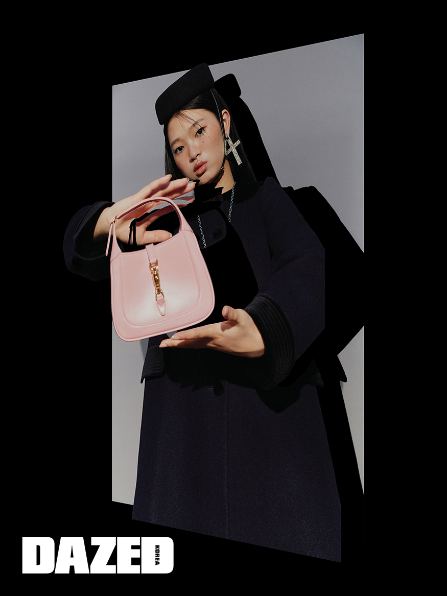 파스텔 핑크 재키 1961 스몰 호보 백과 울 모헤어 코트, 블랙 펠트 해트, 크로스 모티브 실버 싱글 이어링과 네크리스는 모두 구찌(Gucci).