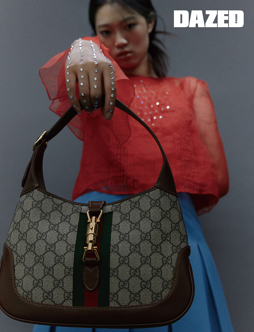 GG 수프림 캔버스 재키 1961 스몰 호보 백과 크리스털 디테일 오간자 블라우스, 플리츠 스커트는 모두 구찌(Gucci).