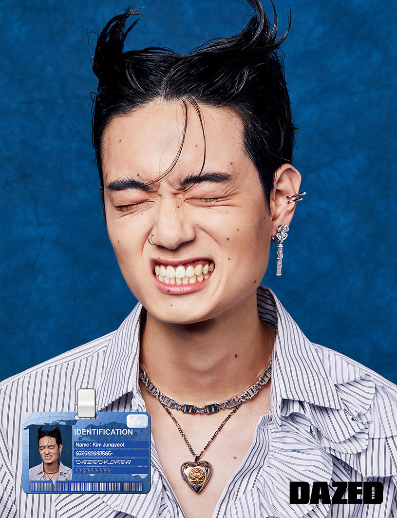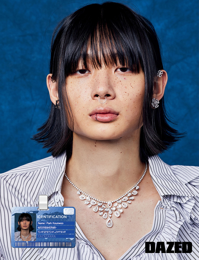 프릴 셔츠는 루이 비통(Louis Vuitton), 이어커프와 하트 펜던트 네크리스는 알렉산더 맥퀸(Alexander McQueen), 화이트 골드 소재에 라운드 다이아몬드와 파베 다이아몬드를 세팅한 이어링은 불가리(Bvlgari), 로고 체인 네크리스는 디올 맨(Dior Men).