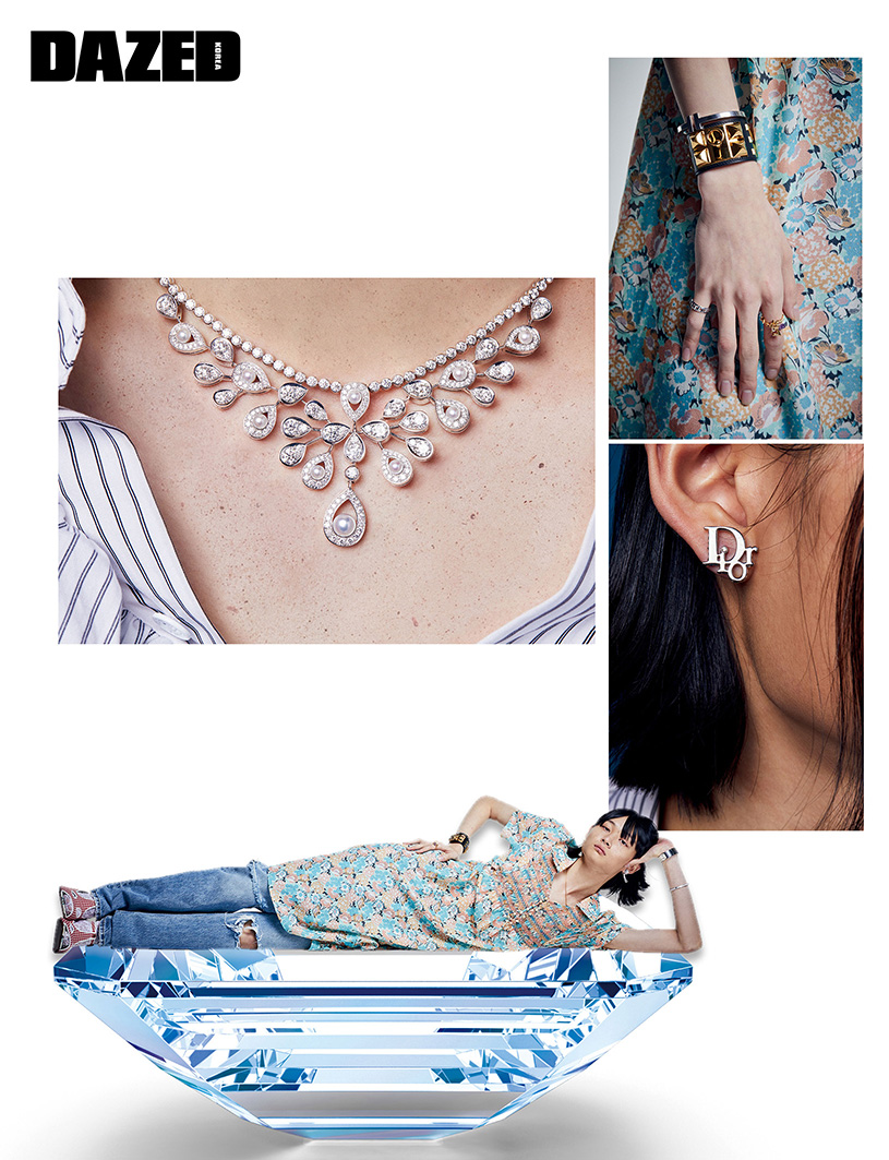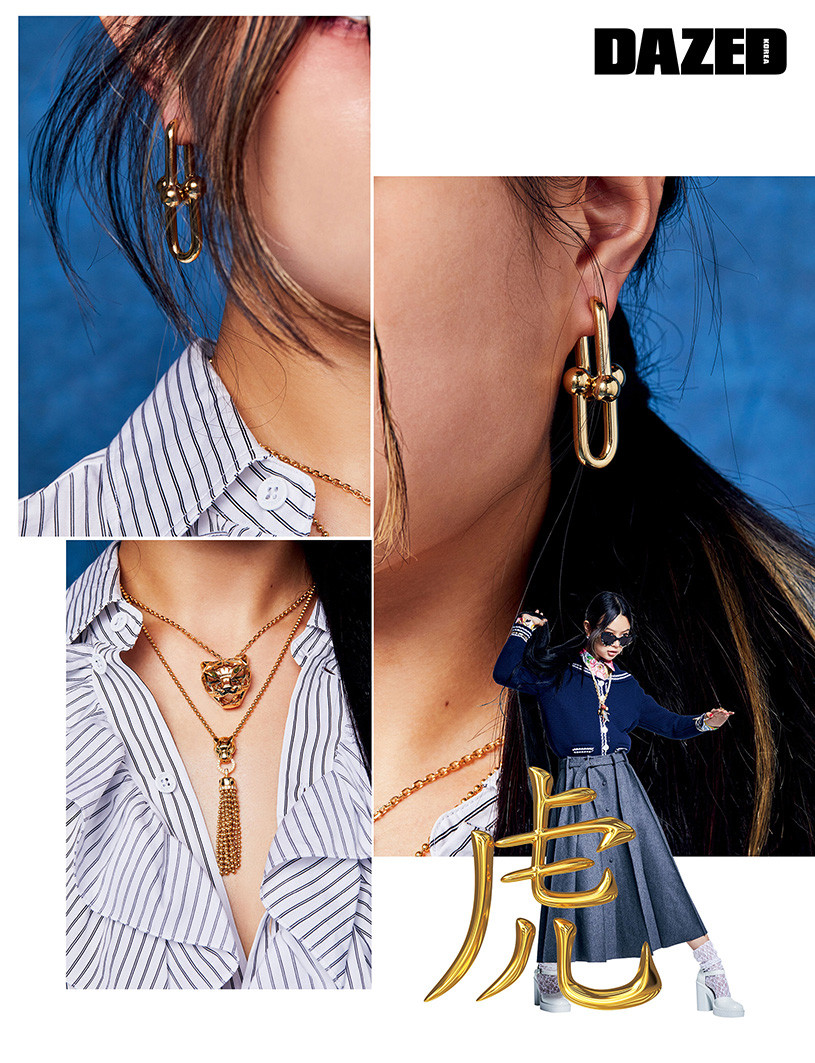 드레스와 데님 팬츠, 메리제인 샌들은 모두 구찌(Gucci), 왼쪽에 착용한 이어링과 골드 링은 루이 비통(Louis Vuitton), 오른쪽에 착용한 화이트 골드 소재에 라운드 다이아몬드와 파베 다이아몬드를 세팅한 이어링은 불가리(Bvlgari), 로고 네크리스와 실버 링은 펜디(Fendi), 스터드 디테일 레더 브레이슬릿과 클릭아슈 브레이슬릿은 에르메스(Hermès), 왼쪽에 착용한 T 스퀘어 브레이슬릿과 T와이드 풀 다이아몬드를 세팅한 힌지드 뱅글은 티파니(Tiffany & Co.).