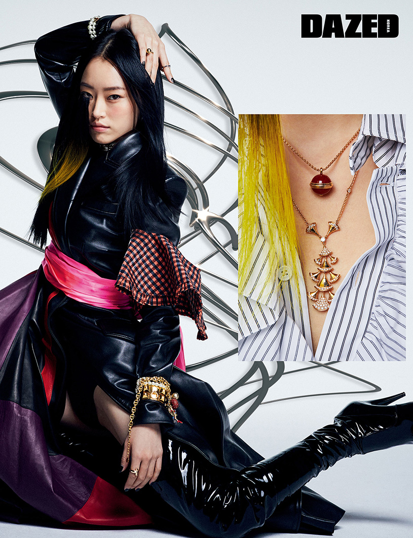 레더 코트는 알렉산더 맥퀸(Alexander McQueen), 허리에 두른 핑크 드레스는 에어리어 by 네타포르테(Area by Net-A-Porter), 팔에 묶은 체크 칼라는 가니(Ganni), 사이하이 부츠 힐은 생 로랑 by 안토니 바카렐로(Saint Laurent by Anthony Vaccarello), 네크리스로 연출한 체인 브레이슬릿과 스터드 디테일 레더 브레이슬릿은 에르메스(Hermès), T1 링과 하드웨어 볼 링은 모두 티파니(Tiffany & Co.), 양팔에 브레이슬릿으로 연출한 네크리스는 디올(Dior).