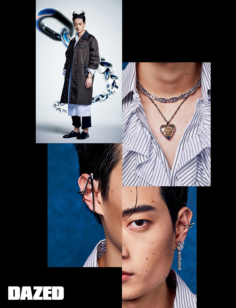 코트는 프라다(Prada), 롱 셔츠는 디올 맨(Dior Men), 블랙 팬츠는 생 로랑 by 안토니 바카렐로(Saint Laurent by Anthony Vaccarello), 타비 슈즈는 메종 마르지엘라(Maison Margiela), 스터드 형태의 클래쉬 드 까르띠에 네크리스와 링, 저스트 앵 끌루 링은 모두 까르띠에(Cartier), 중지에 착용한 T 트루 와이드 링과 왼쪽에 낀 하드웨어 링크 브레이슬릿은 티파니(Tiffany & Co.), 팔에 착용한 포제션 더블 뱅글과 오픈 뱅글은 모두 피아제(Piaget).