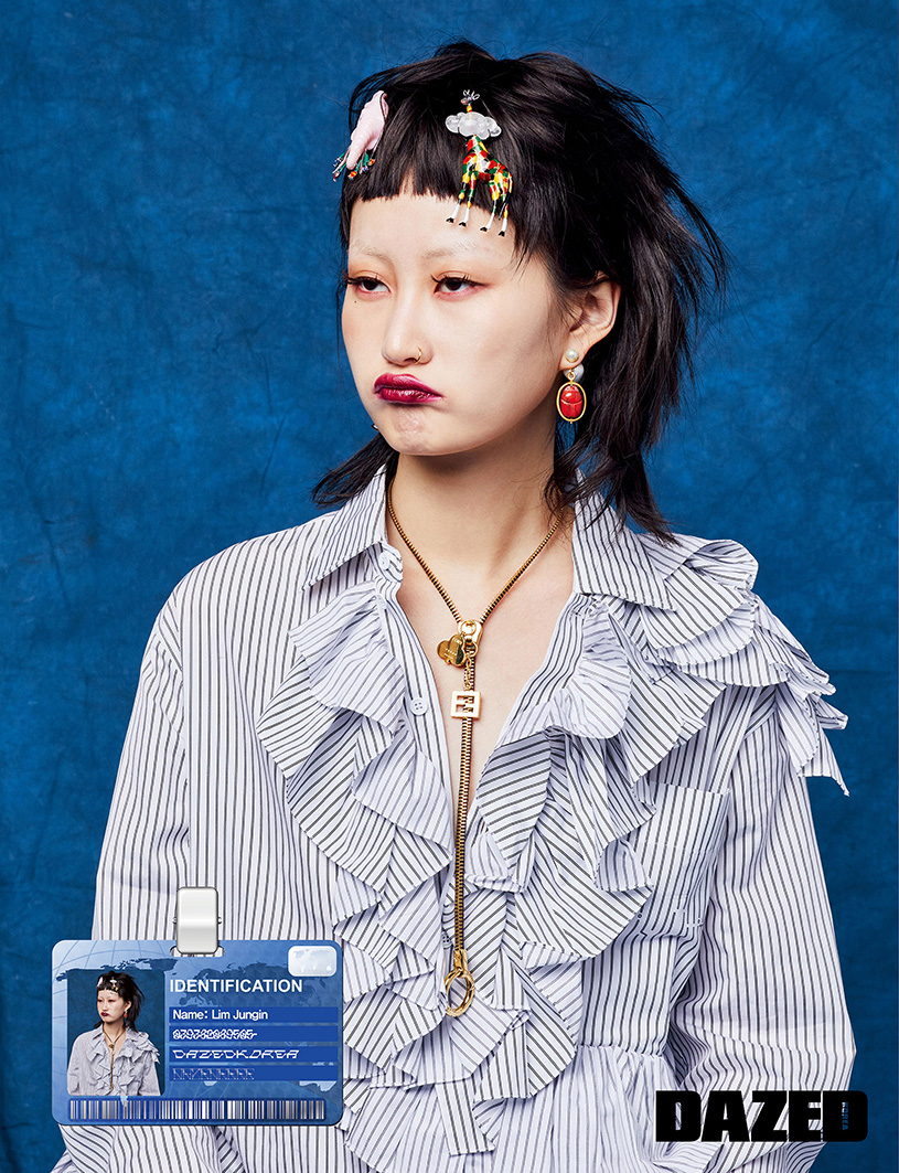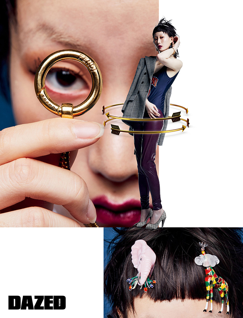 프릴 셔츠는 루이 비통(Louis Vuitton), 이어링은 디올(Dior), 지퍼 디테일 네크리스는 펜디(Fendi), 헤어핀으로 연출한 사파이어, 핑크 오팔, 탄자나이트, 투르말린을 세팅한 코끼리 브로치와 그랑 푀 에나멜, 나무, 크리스털, 오닉스, 브릴리언트 컷 다이아몬드를 세팅한 기린 브로치는 쇼메(Chaumet).