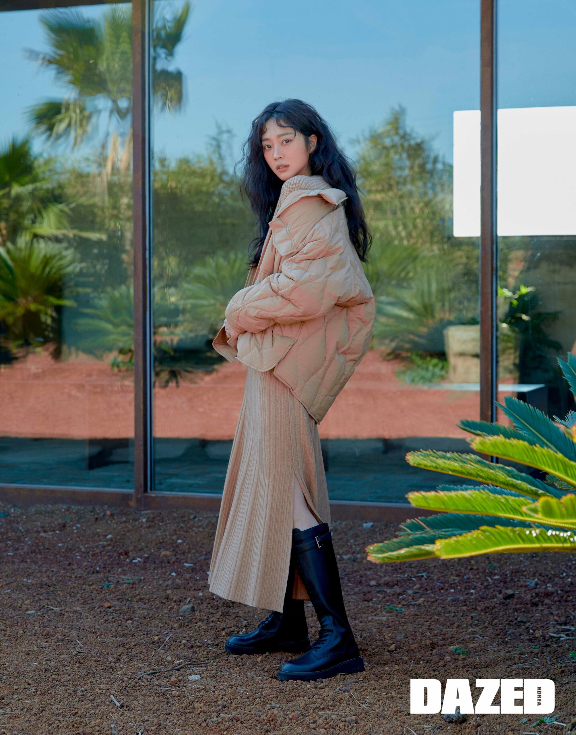 베이지 쇼트 다운 점퍼와 니트 카디건, 스커트는 모두 바네사브루노 아떼(Vanessabruno Athe), 블랙 레이스업 니하이 부츠는 73아우어스(73hours).