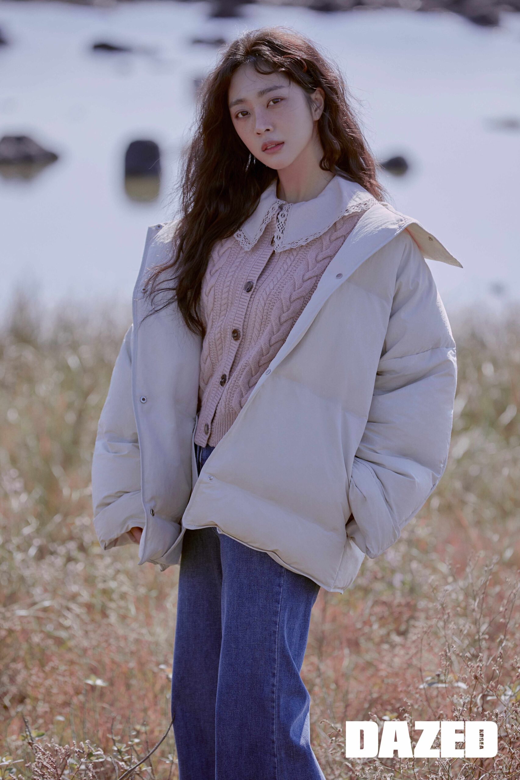 베이지 빅 칼라 블라우스와 핑크 카디건, 쇼트 다운 점퍼, 블루 데님 팬츠는 모두 바네사브루노 아떼(Vanessabruno Athe).