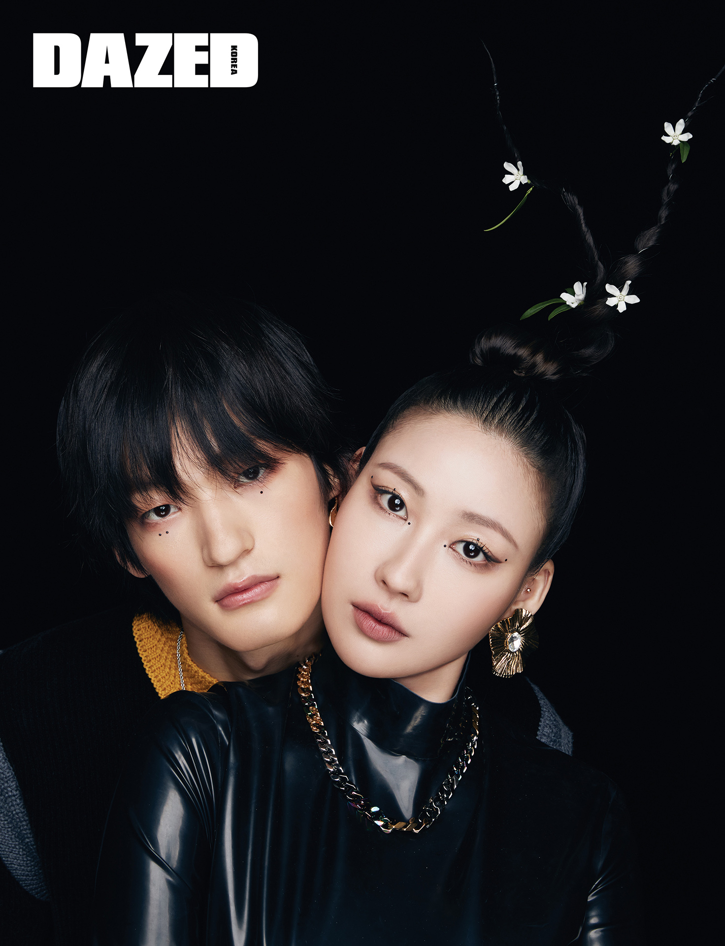사배가 입은 터틀넥 톱과 이어링은 생 로랑 by 안토니 바카렐로(Saint Laurent by Anthony Vaccarello), 네크리스는 루이 비통(Louis Vuitton). 승찬이 입은 니트 톱은 펜디(Fendi), 네크리스는 루이 비통(Louis Vuitton).