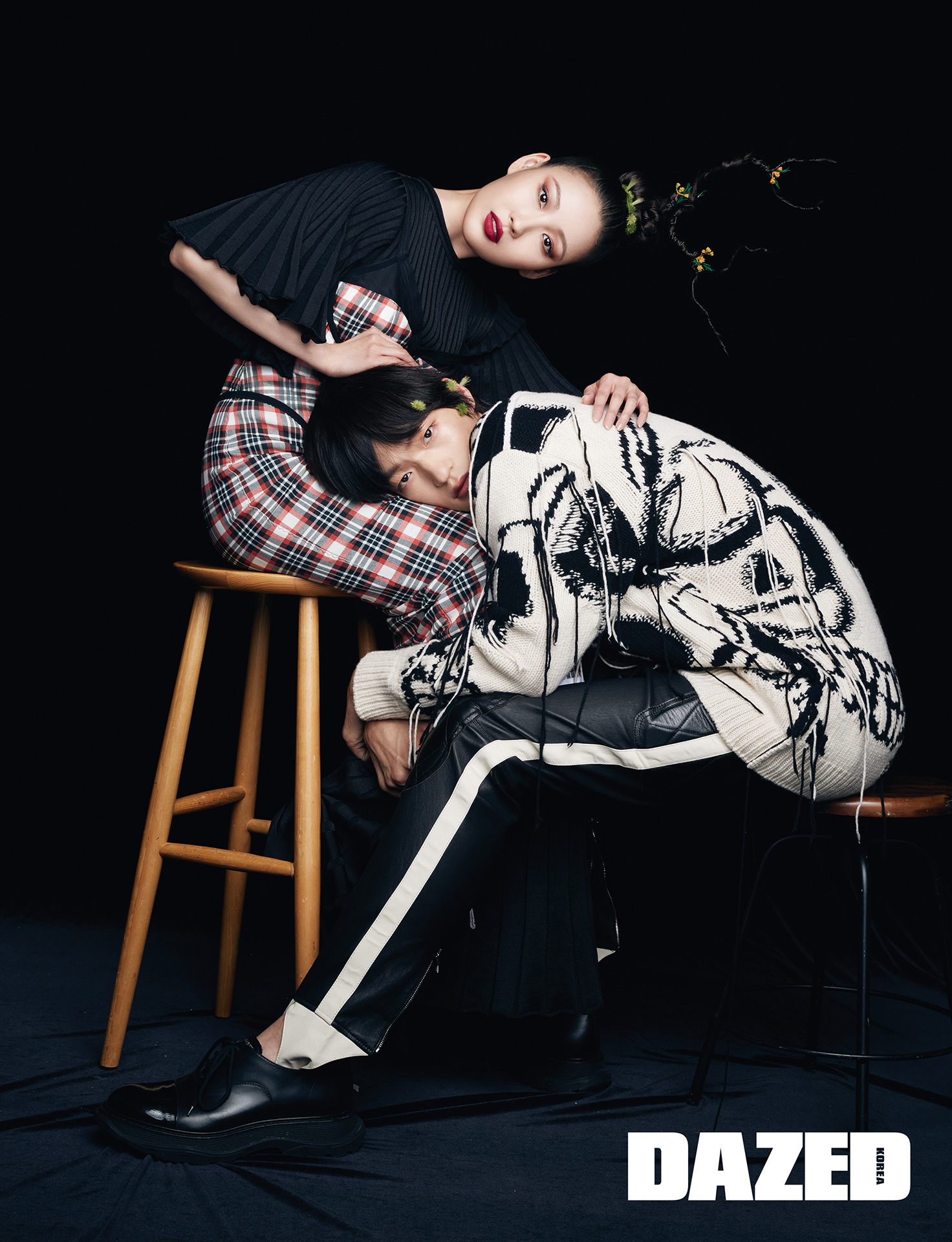 사배가 입은 플리츠 원피스는 보테가 베네타(Bottega Veneta), 체크 숄더 원피스는 버버리(Burberry). 승찬이 입은 패턴 니트 톱과 팬츠, 슈즈는 모두 알렉산더 맥퀸(Alexander McQueen).