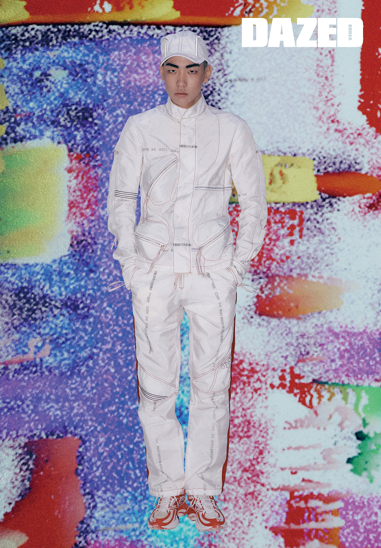 버려진 에어백을 재활용해 만든 재킷과 팬츠, 모자는 모두 강혁(Kanghyuk), 스니커즈는 강혁X리복(KanghyukXReebok).