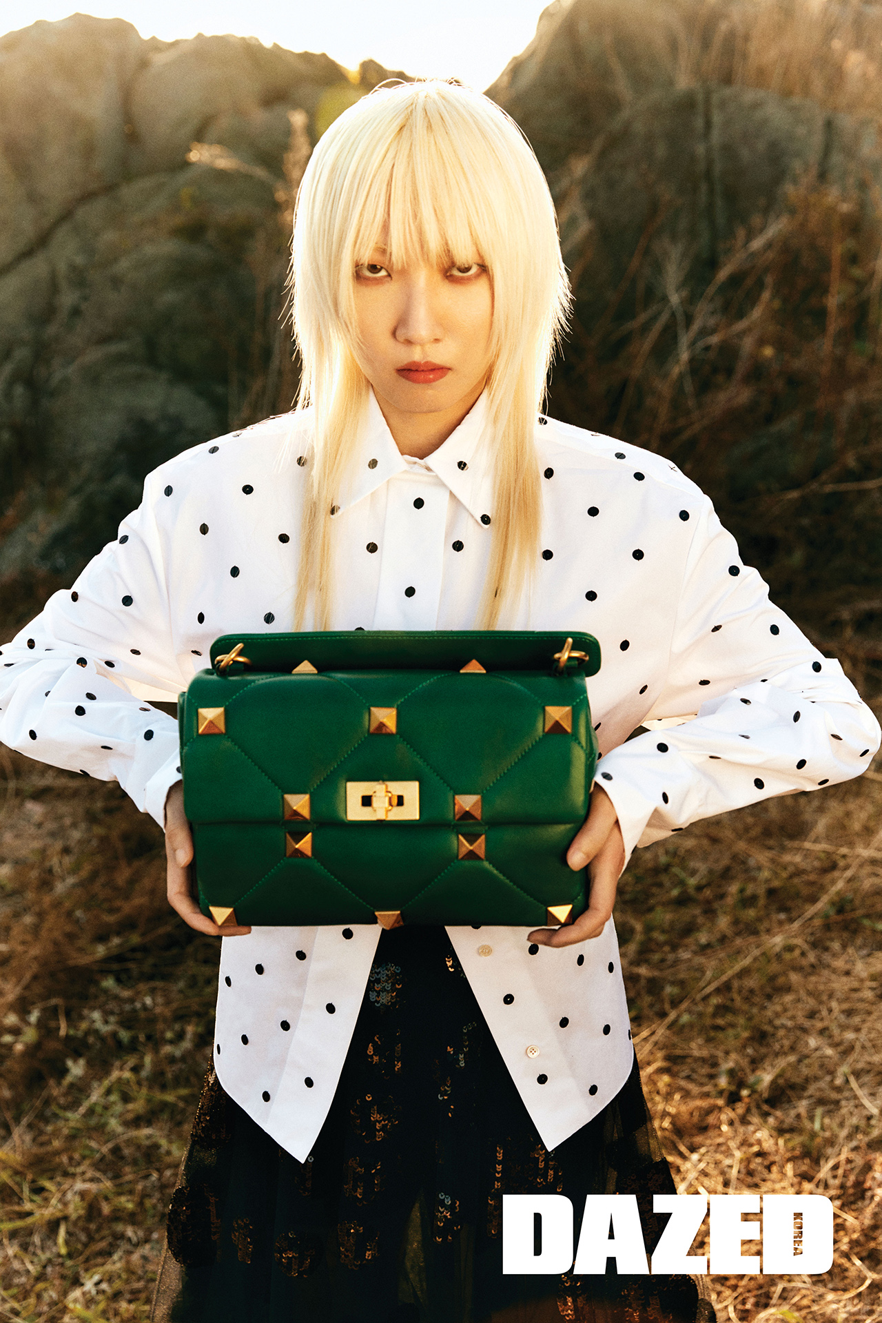 비즈 엠브로이더리 셔츠와 시스루 스커트는 발렌티노(Valentino), 정글 그린 로만 스터드 백은 발렌티노 가라바니(Valentino Garavani).