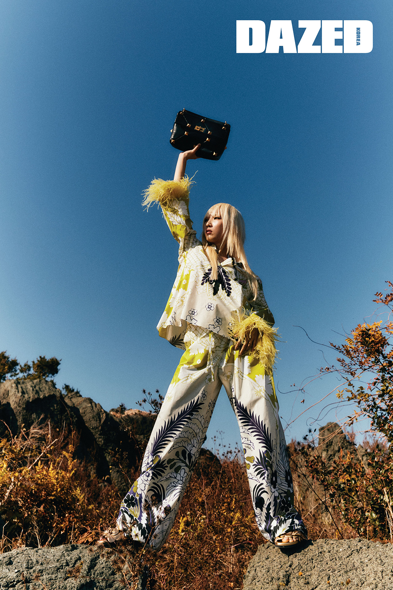 타조 털 디테일 블라우스와 프린트 팬츠는 발렌티노(Valentino), 블랙 로만 스터드 백과 아틀리에 슬라이드는 발렌티노 가라바니(Valentino Garavani).