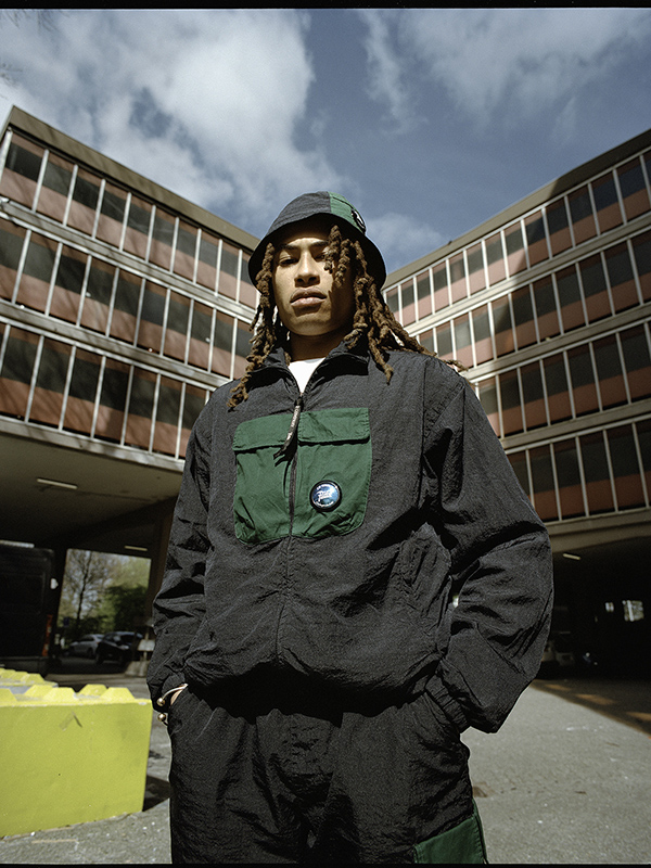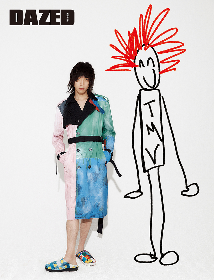 멀티 프린트 트렌치 코트는 더 뮤지엄 비지터(The Museum Visitor), 패딩뮬은 더 뮤지엄 비지터X수부(The Museum VisitorXSubu).
